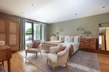In keeping with the eco feel and the woodland walks, the bedroom has a beautiful bamboo bed, super-king size for added luxury. The en suite bathroom has under-floor heating, a walk-in drench-head shower, an oval free-standing double-ended bath and matching wash-basins perched upon polished granite.