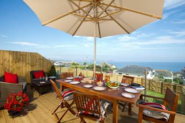 Outside, the wonderful south-facing elevated deck-area is accessed from the sitting-room, with outdoor dining furniture and a rattan sofa, chair and tables. The panoramic 180 degrees view stretches from Pednavan Point to Nare Head and Gull Rock right over to Portscatho harbour and Pencabe. Steps from the deck lead down to a fully enclosed lawned rear garden.