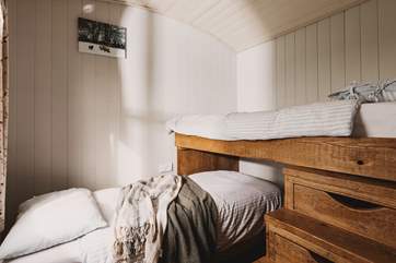 There is a fully fitted kitchen in one corner with full-size oven and fridge and all the equipment you will need for your stay. The lovely en suite shower-room is along the corridor leading to the spacious double bedroom. The second bedroom consists of a double bed, suitable for both adults and children, with a single bed above (please note that the single bed is only suitable for children aged 10 years or younger) and this room can be made up as two singles if preferred. This fabulous place gives the special shepherd's hut glamping experience to a family as well as for couples of course.