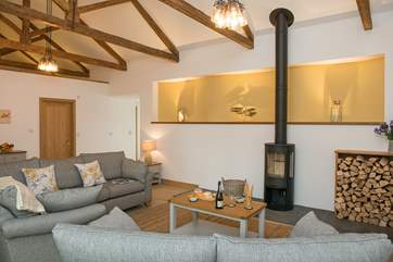 Open plan living-room with kitchen and dining areas. Smart TV and wood-burner. Electric cooker, microwave, fridge, freezer, washing machine/drier and dishwasher
