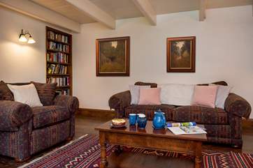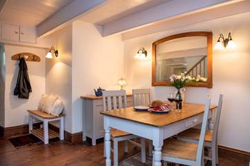 There is plenty of space to relax at the cottage, with your only neighbour being the owner who is in the next door cottage from time to time. The large sitting-room overlooks the pretty front garden and has a large wood-burner to snuggle down in front of with a good book and a glass of wine. Just a little step up takes you into the dining-area which is a perfect spot for planning the next adventure or of course eating a tasty meal. Three steps down lead you to the kitchen, which overlooks the private back garden, surrounded by trees with glimpses of the surrounding countryside. There is a handy utility-room which is perfect for wet swimming costumes or muddy dogs and boots and a separate WC on the ground floor. Upstairs, the bedroom has a super-king bed, so you can stretch out and relax while listening to the morning chorus; if you are lucky you might get brought breakfast in bed!