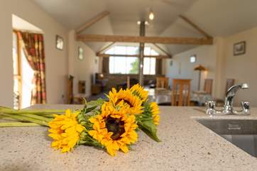 With two steps up to the front entrance, The Piggery has a lovely open plan living/dining/kitchen space, with a double sided wood-burning stove as a focal point to the room. High beamed ceilings speak of the history of what was a traditional working farm building. The outside wall-mounted drinking troughs have been brilliantly converted into lighting for the patio.