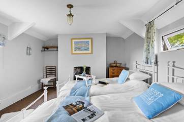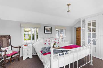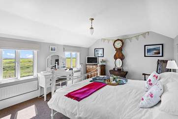 The main bedroom boasts an olde worlde charm with wonderful furniture and a unique dressing-table married together with crisp white linens and stylish interiors. Being situated to the front of the house you have spectacular views across to the coast which can be enjoyed from the comfort of your bed with the first cuppa of the day. This room will be bathed in light all day and benefits from a vanity sink.