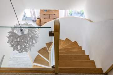 On the first floor three beautifully furnished bedrooms await you. Framed by glass doors, savour the panorama across Porthtowan from the main king-size bedroom. Finished with a balcony and en suite shower-room, you'll never want to leave. Next door (across a little stepped landing and over one of two staircases), a twin bedroom looks out across the bay and leads into an en suite shower-room which is shared with bedroom number three. A second staircase (a gorgeous bespoke hand-crafted spiral) takes you down to the ground floor. Tucked away on the ground floor, a stylish 'zip and link' bedroom can be found next to the large contemporary family bathroom. Further along the corridor you will find the en suite king-size bedroom, with patio doors which lead out onto the terraced patio garden and hot tub. On this floor you will also find the utility-room and downstairs WC which are perfectly placed for washing away sandy toes and hanging up those wet coats after coming off the coast path and into the warm.