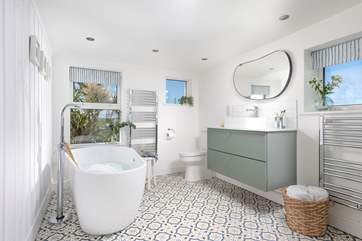 Head upstairs to discover the four gorgeous bedrooms. You'll find three bedrooms on the first floor, and the gorgeous main bedroom on the second floor, decorated in calming coastal blues with a sumptuous double bed, beautiful views over the countryside and a fabulous en suite shower-room. There's a very sweet twin room and a cute bunk room which the children will love! Finally there's a gorgeous double room - ideal for leisurely breakfasts in bed after a restful night's sleep. The family bathroom is quite a treat, with a simply divine free-standing bathtub and a spacious, stylish shower. You're sure to look forward to a long soak in the tub after a day of adventuring - bliss.