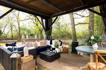 Decking leads to another dining-area, which is a nice spot for breakfast or afternoon tea, and stairs lead to the second floor where there is a bistro table and chairs and the most amazing views of the woodland and surrounding farmland.