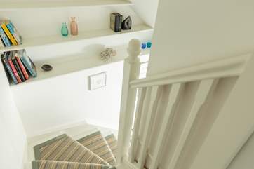 Climb the stairs, (take care as they are traditional steep cottage style stairs) to the first floor where two bedrooms and the family bathroom await. Gorgeous bedroom one has a comfy king-size bed, dressed in lovely linens and an en suite shower-room whilst bedroom two has twin beds, ideal for either adults or children. The family bathroom has a bath with shower over head so you can choose either a long soak or a refreshing shower after a busy beach day.