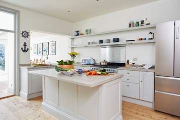 The front door is up a couple of small steps and once over the threshold you are welcomed by a large hallway with restored original features. The sitting-room to the front is spacious and light, with high ceilings and a warming wood-burner, perfect for the cooler months. Comfy sofas beckon you to relax after a busy beach day and the Smart TV will entertain the family.